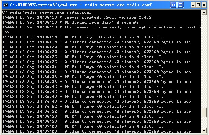 打开一个cmd窗口 使用cd命令切换目录到 C:\redis 运行 redis-server.exe redis.conf 。